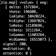 Note the ‘eeg’ object’s ‘signal’ key. A good signal is ‘0’. ‘200’ is totally disconnected. Hair can cause interference, so hold it back. Also make sure the electrode is above your left brow on a clean skin surface, and clip the grounder to your left earlobe. Hold really still. If the signal doesn’t come down, try restarting the server. If you’re still having trouble, check the Bluetooth connection again. There could be any number of issues I’m missing here you may need to troubleshoot based on the system you’re using, so this list is by no means exhaustive.